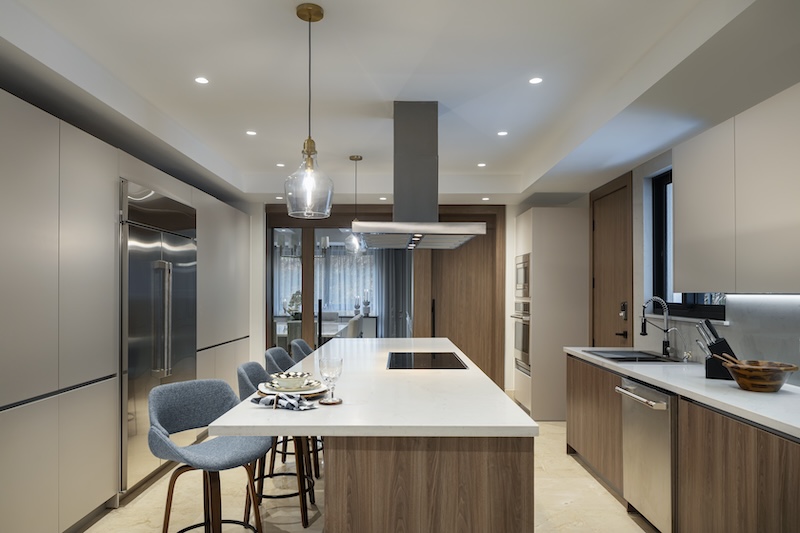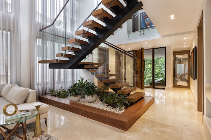 En este proyecto el objetivo era lograr un ambiente compacto, integrar todo el programa de áreas respetando la diagramación estructural de la casa y enfatizando la verticalidad con una lucarna sobre la escalera. Al mismo tiempo generar la mayor integración del espacio interior al exterior: aprovechando las visuales hacia el “corredor verde” que dibuja el cauce del canal de aguas lluvias del sector Los Pinos, Arroyo Hondo.