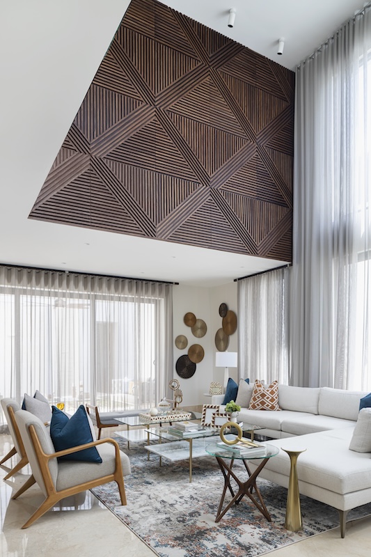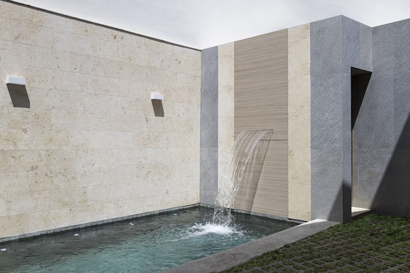 Para la volumetría el objetivo central fue lograr una fachada de geometría simple, líneas rectas y con pocos elementos decorativos. Los materiales de la fachada son piedra, madera, metal y cemento. La piedra se incorpora solo en el nivel de estacionamiento vinculándola al terreno como un elemento homogenizador de la base sobre la cual se apoya la casa. El resto de los materiales fueron dispuestos en los niveles superiores de la vivienda, otorgando ligereza y contemporaneidad a su arquitectura.